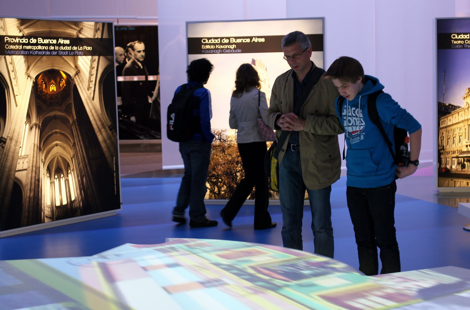 Ein Labyrinth aus weißen Stoffbahnen, die von der Decke hingen und mit Zitaten berühmter Autoren wie Jorge Luis Borges und Julio Cortázar bedruckt waren. Große Wände – in Buchform? – lenkten die Betrachter von einem zum nächsten Foto: argentinische Sehenswürdigkeiten und berühmte Persönlichkeiten der Stadt – allem voran die Autoren. Das Colón Theater in Buenos Aires, das Kavanagh-Gebäude und die Metropolitan Kathedrale der Stadt La Plata, Julio Argentino Roca, die Handabdrücke in der Höhle Cueva de las Manos in Santa Cruz.
