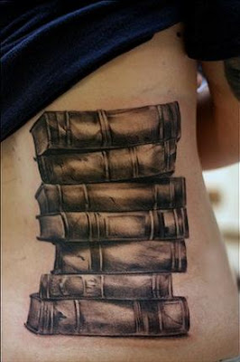 Es ist nahe liegend, dass auch Bücher das Motive bibliophiler Tattoos sein können. Meistens werden richtig alte Schmöker verarbeitet, die auch Walter Moers in seinen Büchern gerne verwendet: Aus Leder, mit Bünden und Einbandverzierungen. Bücher werden generell in allen möglichen Posen abgebildet: Aufgeschlagen, fallend, gestapelt, in Regalen aufgereiht. Der Fokus liegt wirklich am Medium selbst, denn nur selten ist ein Buchtitel oder ein Autor vermerkt. Meistens finde ich die Motive schön, doch auch hier gilt: Je größer das Tattoo, desto unförmiger wirkt es ab und an.